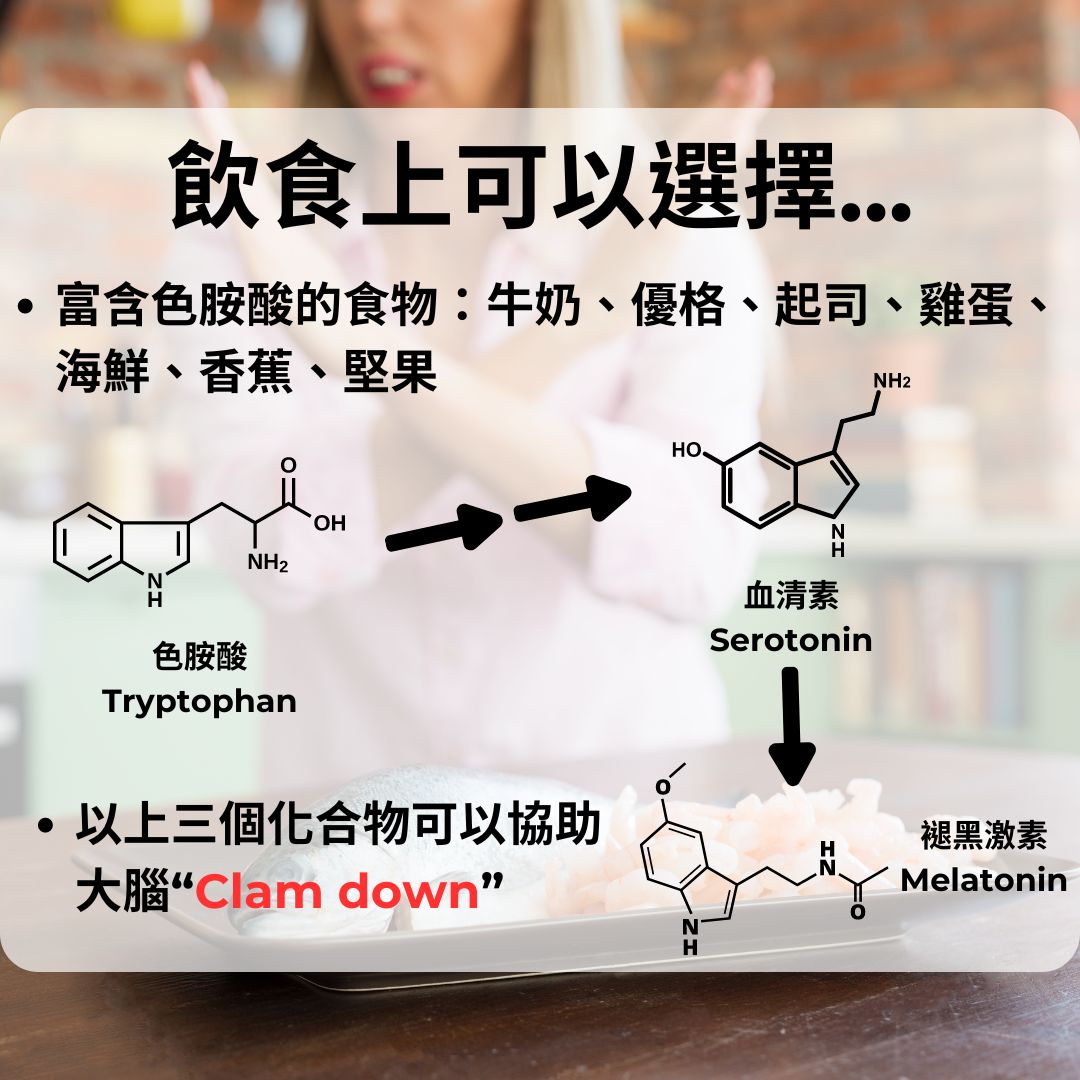 那飲食上我們可以採取什麼樣的措施呢?大家都知道訓練後要即時補充非常重要,這時若是我們可以選擇符合訓練後的補給需求同時也可以有效幫助大腦「冷靜」的食物,那就一舉兩得了!不過什麼哪些食物可以幫助大腦「冷靜」呢?富含色胺酸(Tryptophan)的食物!色胺酸是合成血清素(Serotonin)的原料,補充富含色胺酸的食物,可以幫助血清素合成,將我們從很亢奮的狀態下冷卻下來,那有哪些食物是富含色胺酸的呢?