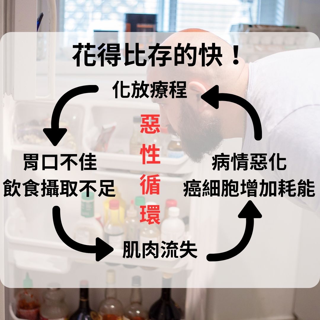 對於癌症患者體內的能量狀態,可以理解為「花得比存的還快」,因為身體需要去對抗癌細胞的關係,在耗能上會比較大,而患者可能會因為治療或是患部的疼痛,而影響了進食的意願,長期下來變成惡性循環,肌肉的大量流失造成了死亡或是預後不佳!