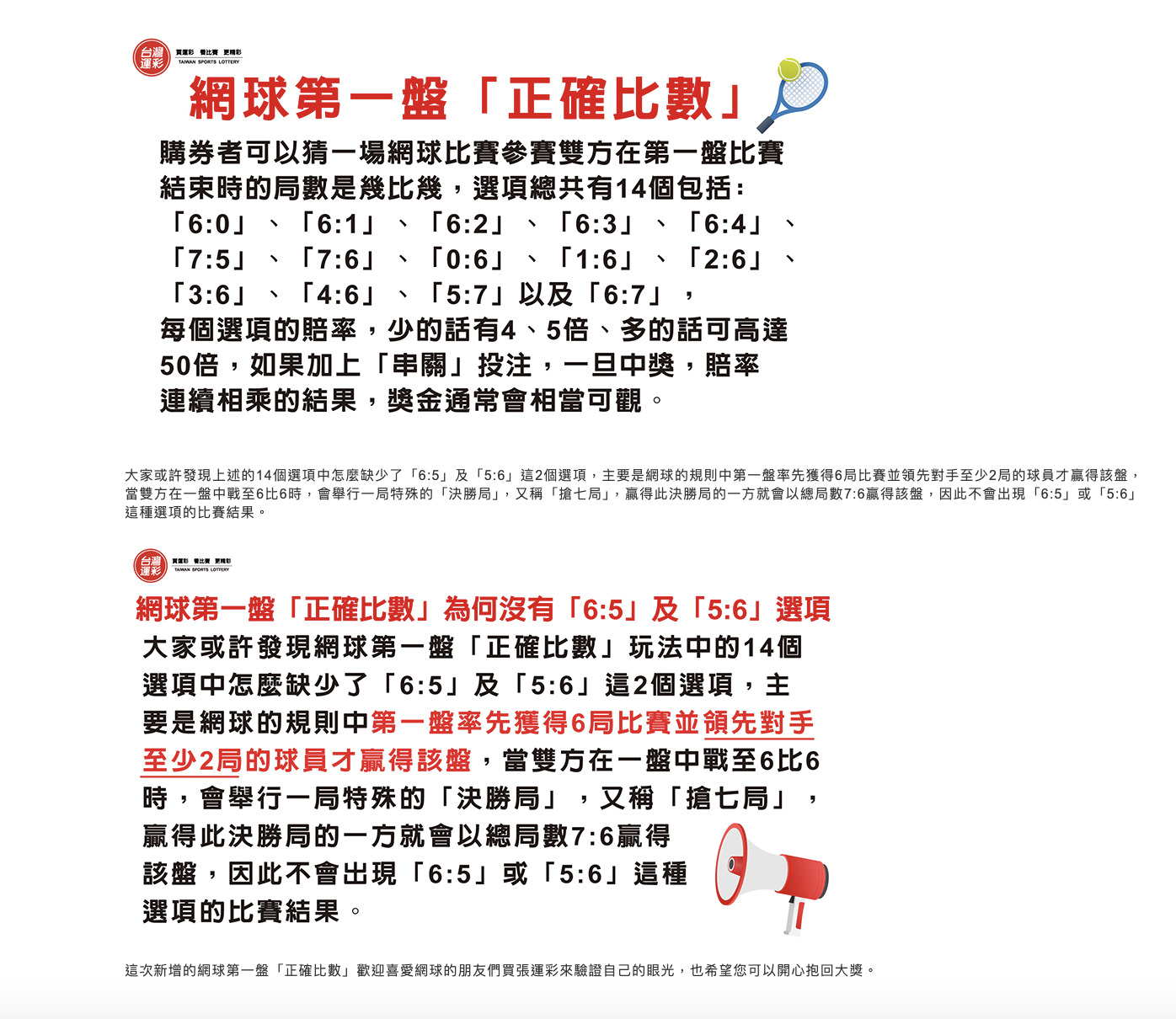 第三屆台灣運彩全新上市,新增網球第1盤「正確比數」的新玩法,購券者可以猜1場網球比賽在第1盤比賽結束時的局數是幾比幾,選項總共有14個。