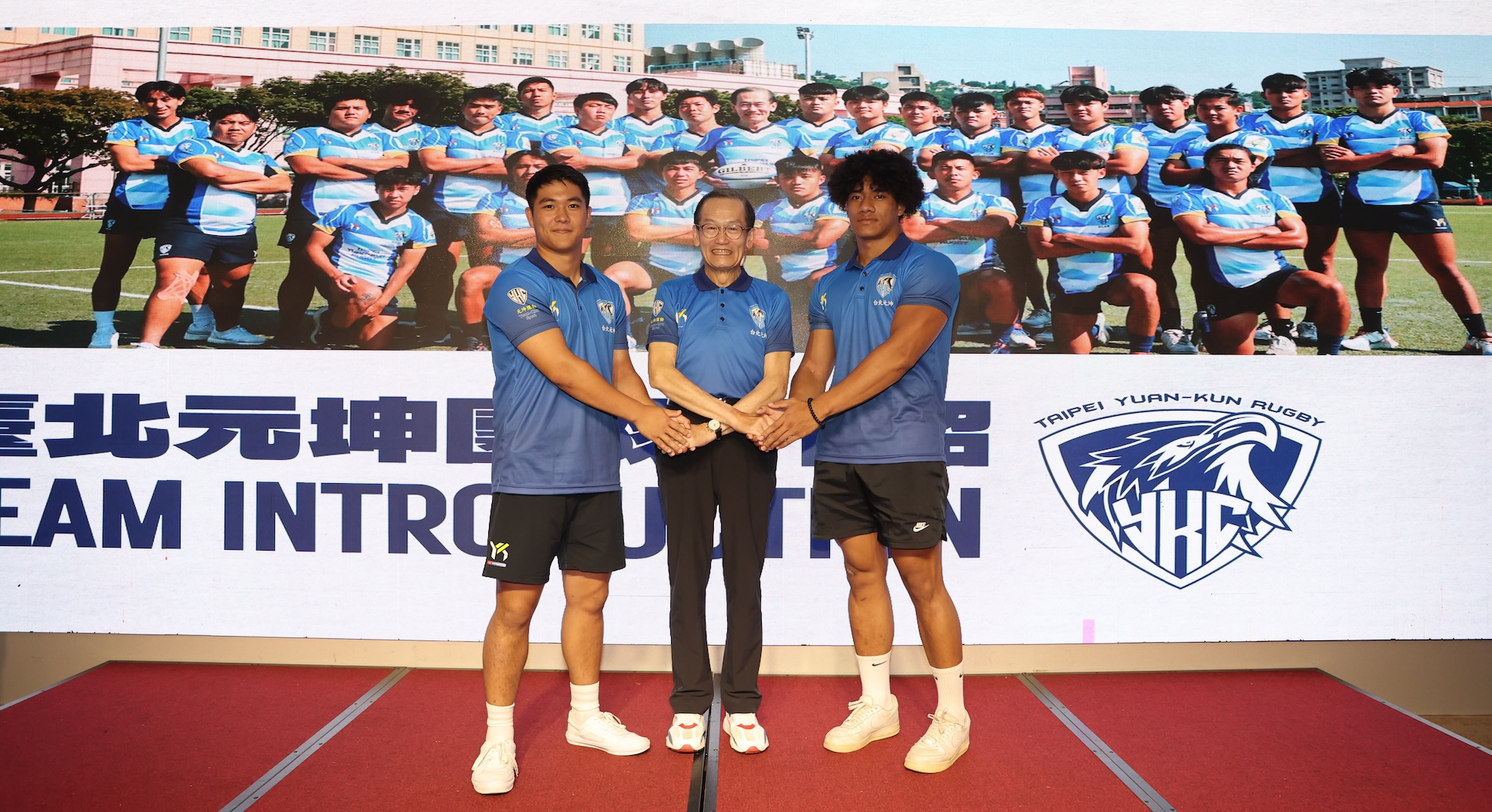 台北元坤橄欖球俱樂部領隊杜元坤(中),與外援日本關西大學橄欖球名校選手雨谷陸椰(左)、混血好手王長恩(右)。(台北元坤提供)