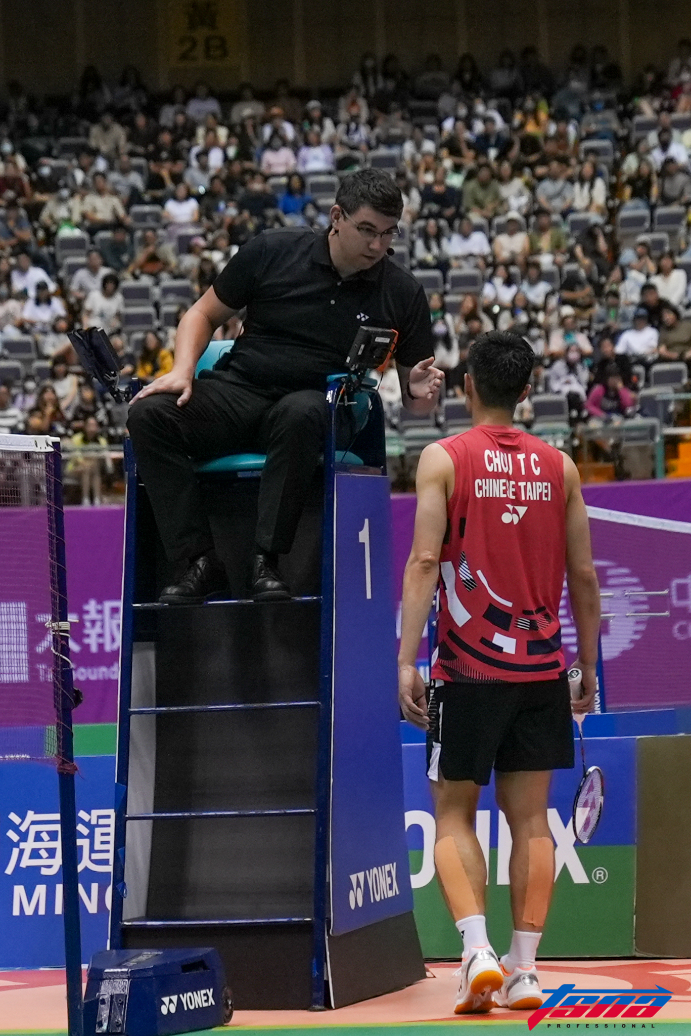 周天成與裁判爭論綁鞋帶問題。(黃以信攝)