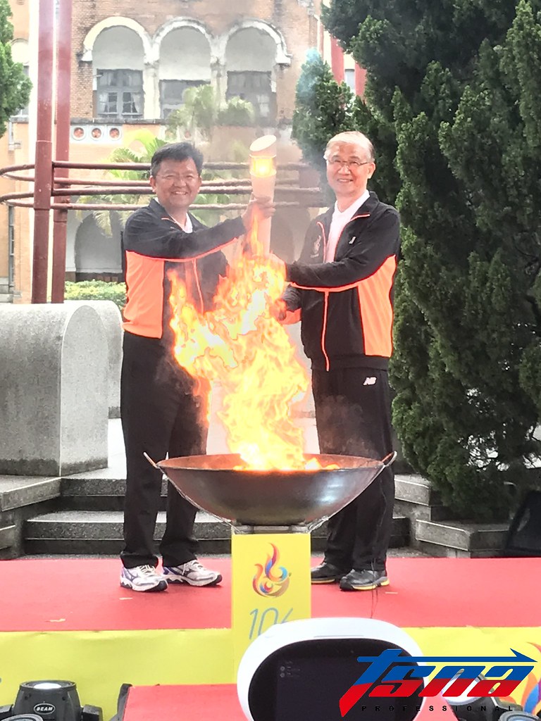 教育部體育署林哲宏副署長(左)、台灣大學楊泮池校長(右)高舉聖火。(鄭廷瑋/攝)