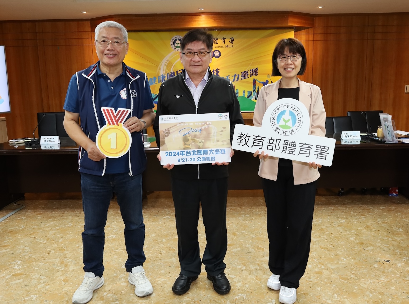 中華民國射擊協會理事長陳士魁(左起)、體育署副署長洪志昌、體育署國際及兩岸運動組長許秀玲組長。(體育署提供)