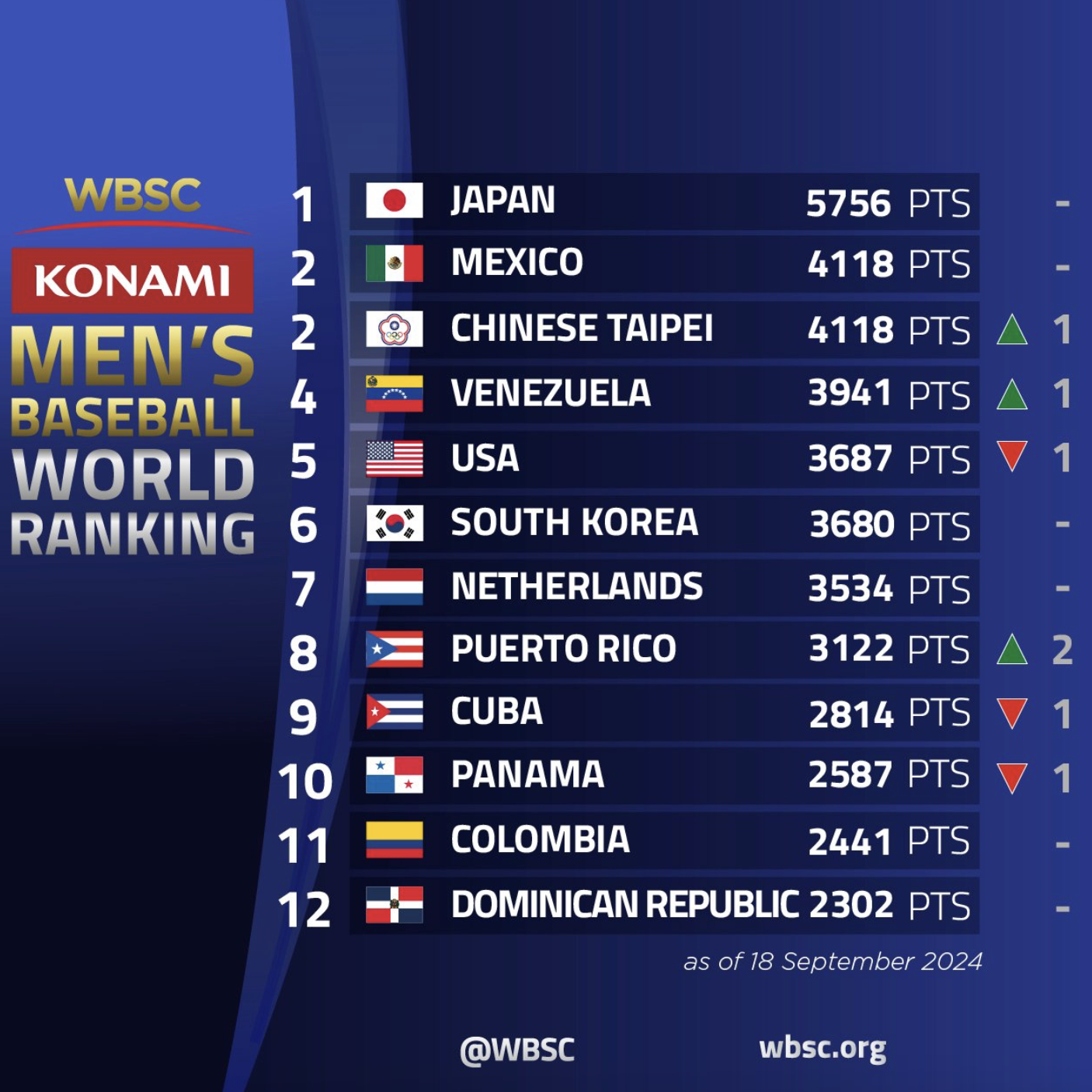 至於棒球強權美國則是下降1名,以積分3687分排名第5,委內瑞拉則是以積分3941分來到第4,第6到第10名依序為南韓、荷蘭、波多黎各、古巴與巴拿馬。
