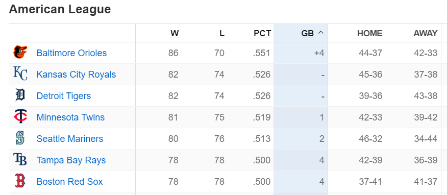 美聯外卡領先的金鶯拉開勝場4場,而皇家與老虎站在外卡擂台邊緣,後面追趕的雙城差1場、水手差2場。