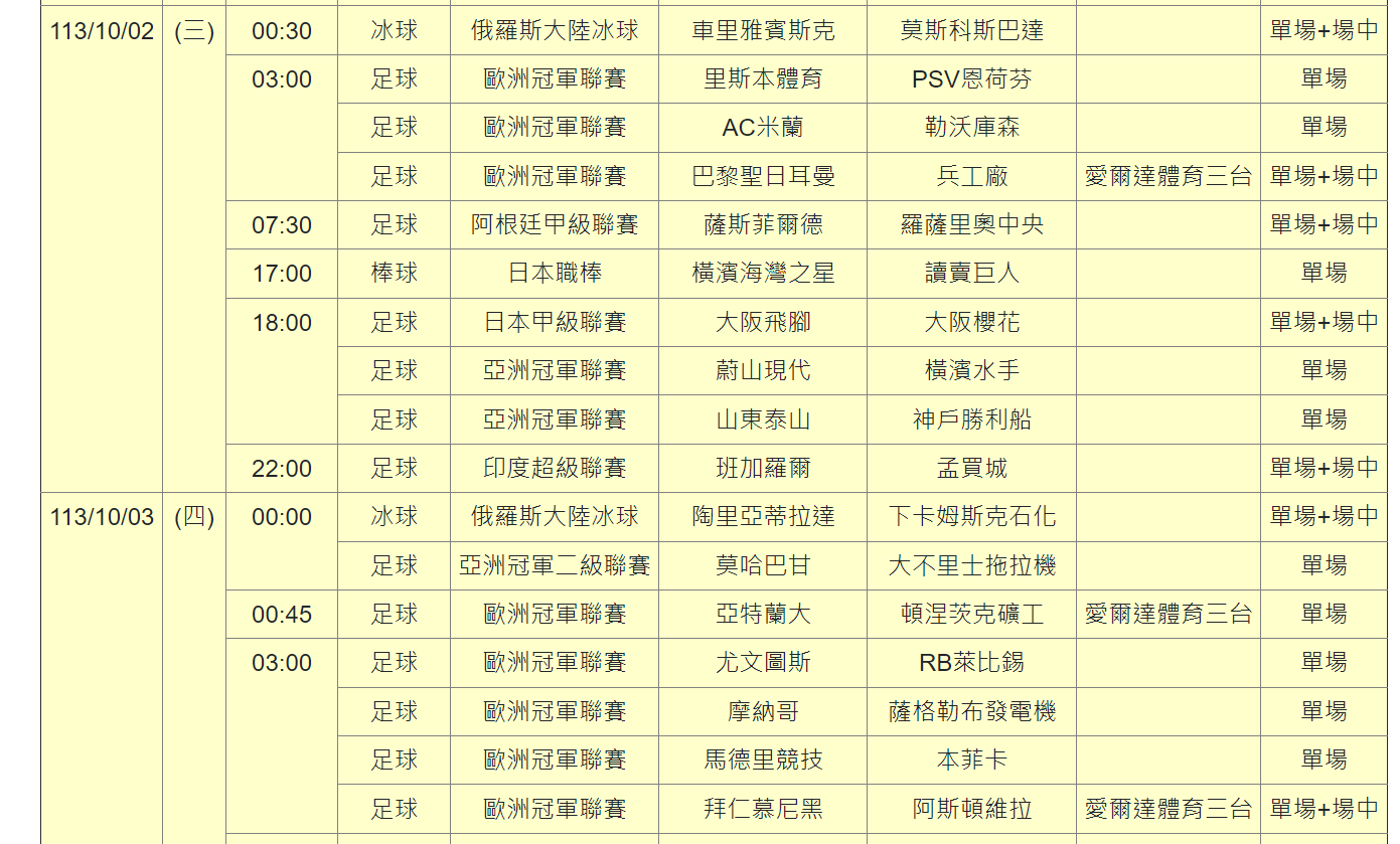 足球方面,上周末五大聯賽幾場讓人意外的戰果,許多彩迷在抱怨哪隊誰誰誰沒先發、誰踢得太離譜了。如果大家看到本周足球的賽程就該知道,明天起又是歐冠、歐足聯杯、亞冠的熱戰。