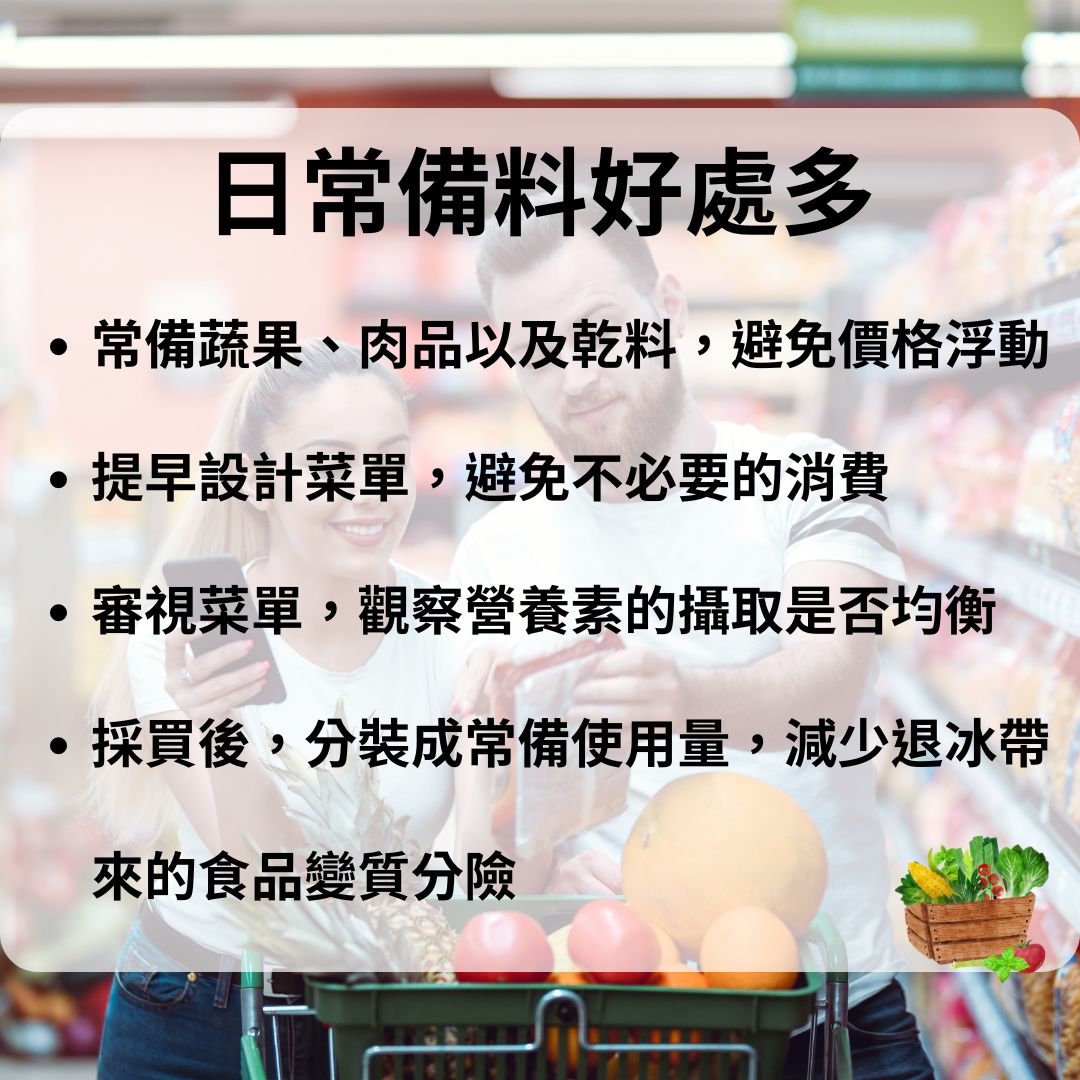 日常備料很重要!每周固定一天去上市場,將未來一周的需要量買齊,這樣的好處是:除了冰箱一直都有安全儲備量可以因應像這幾天的「天災」以外,在去採買之前就設計好菜單,也可以避免許多不必要的花費,並且在一次次的烹調過程中,去對營養素的搭配以及調味進行調整、優化。