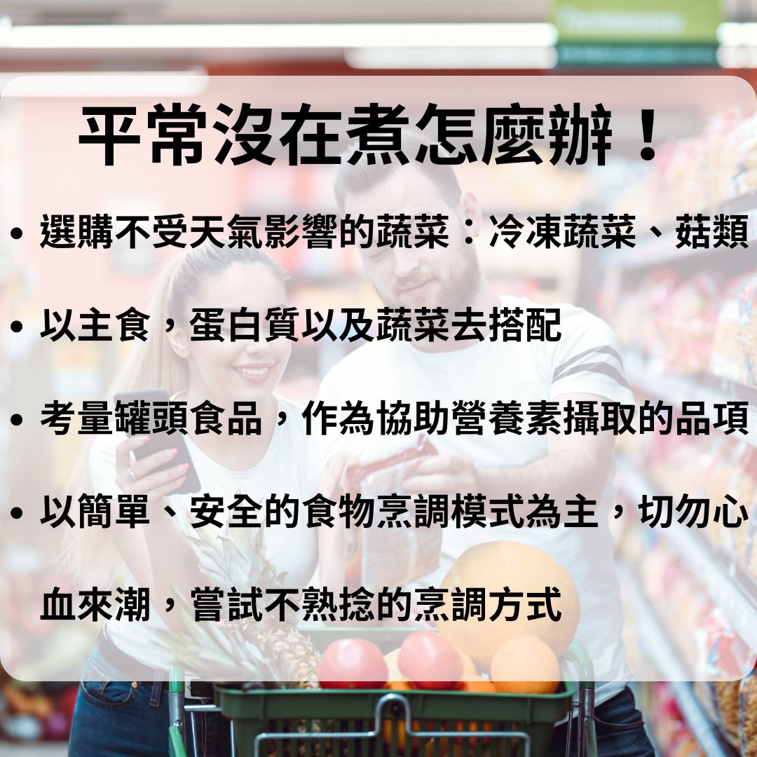 若是平常沒有下廚習慣的民眾,可以選擇較不受「天氣變化」影響的蔬果,除了單單煮泡麵以外,也可以透過各式各樣的食材搭配,來增加營養素的攝取,像是除了蔬果以外,肉類蛋白質也會被大家瘋狂採購,這時也可以考慮罐頭食品,現在食品加工技術的進步,罐頭食品的風味不比生鮮食材還要差,只要妥善調味,不論是味道上還是營養素的攝取,都可以達到我們的日常需求。