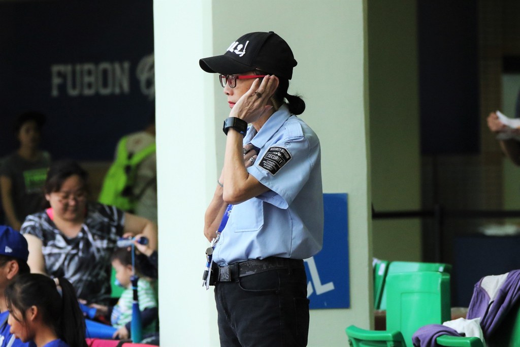 穿上聯盟賽務部"隊長"的制服,傅姊常常站在球場本壘後方的看台,眼神銳利盯著球場上和看台的一舉一動,不開口說話時,很有威嚴,給人一種很嚴肅感的感覺。