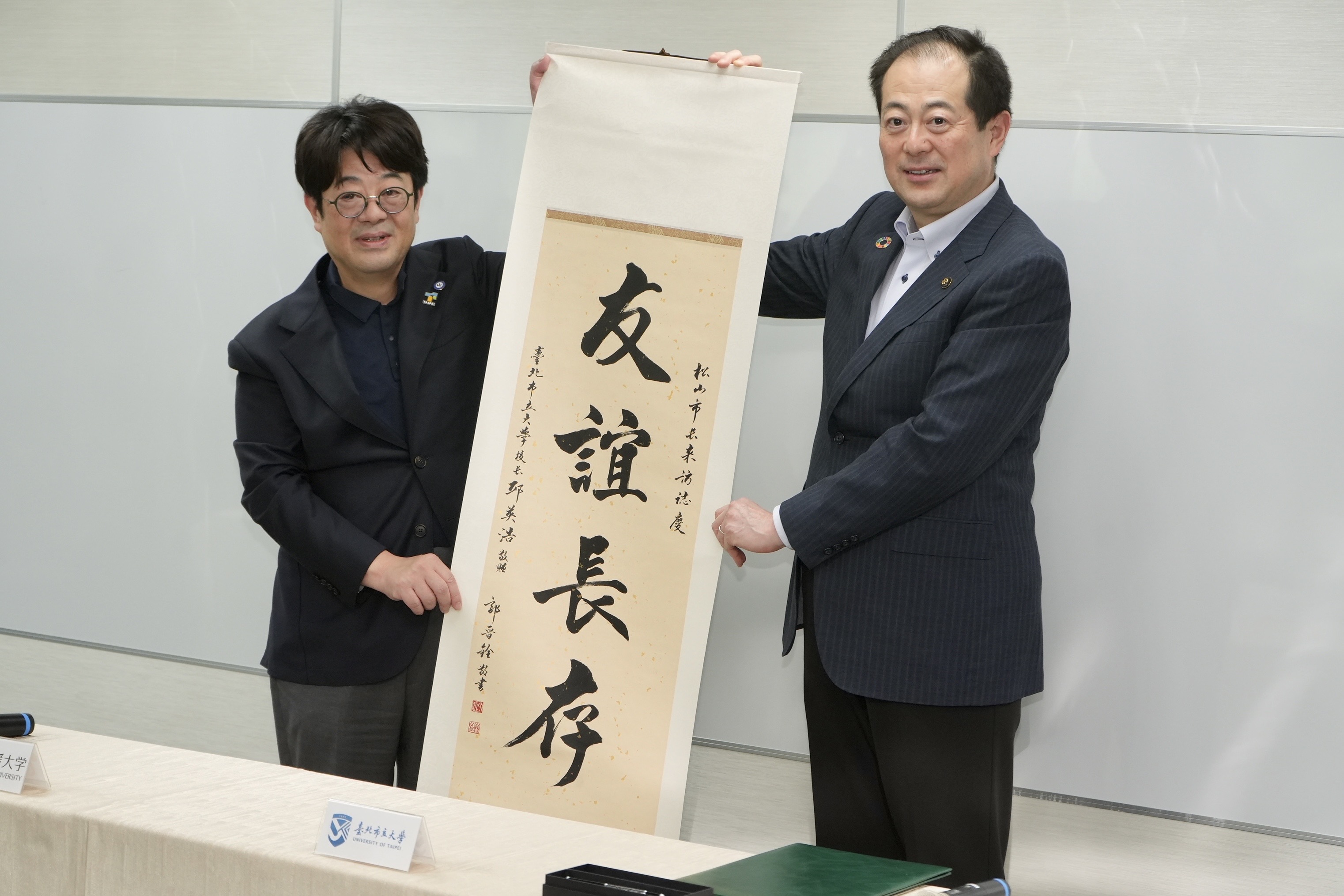 臺北市立大學校長邱英浩(左)、松山市長野志克仁(右)。(李宇政攝)