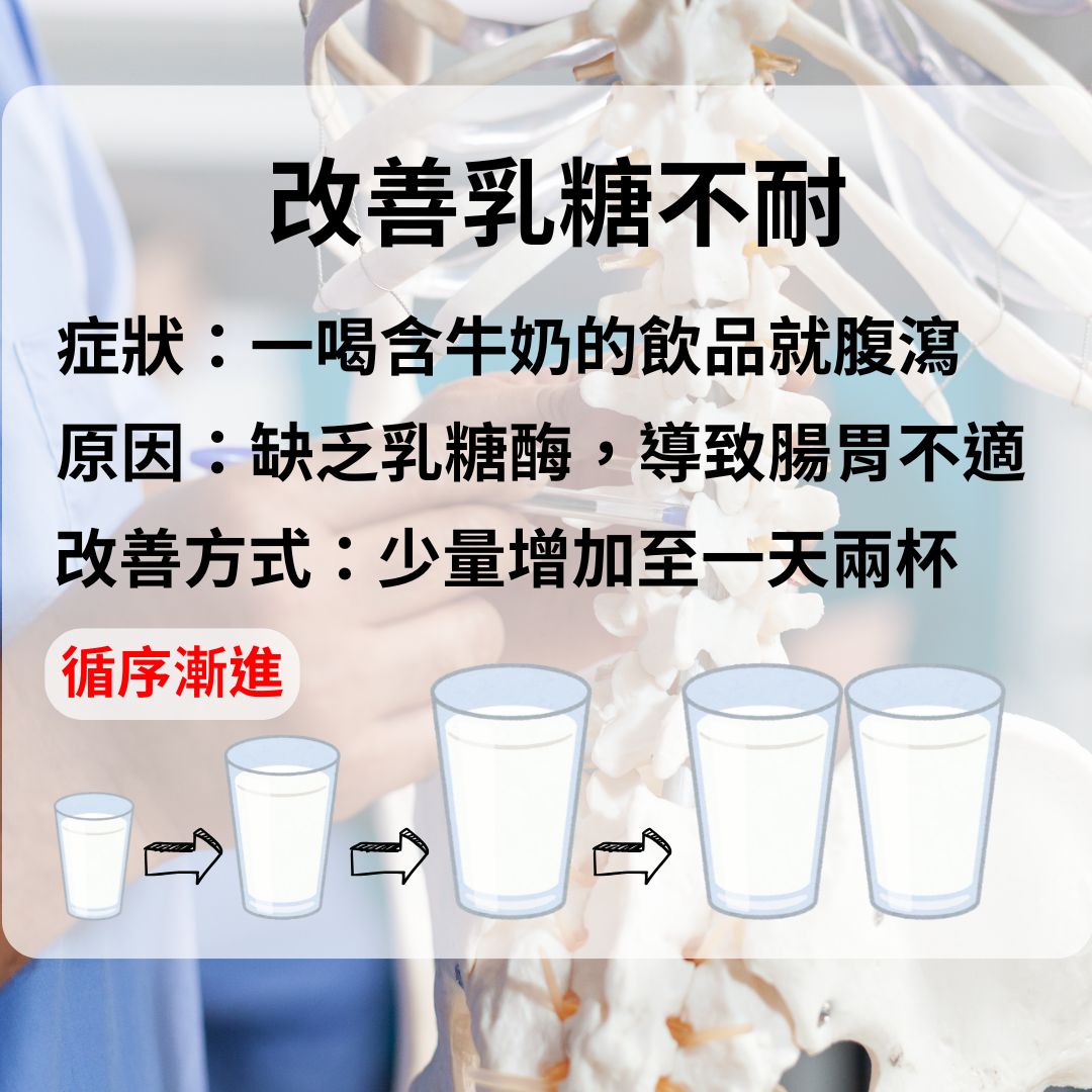 營養師知道其實有許多人都有乳糖不耐症的症狀,不過其實這並非無法治療的,會有這樣的情況主要是因為太久沒有使用乳糖酶,造成乳糖進到腸胃道時,產生脹氣導致腹痛,其實我們只要從少量的開始攝取,少至20-50 ml,每隔一至兩周增加一次攝取份量,這樣就可以有效的改善症狀,否則都要靠補充劑來攝取,這樣會有吃不完的營養品~