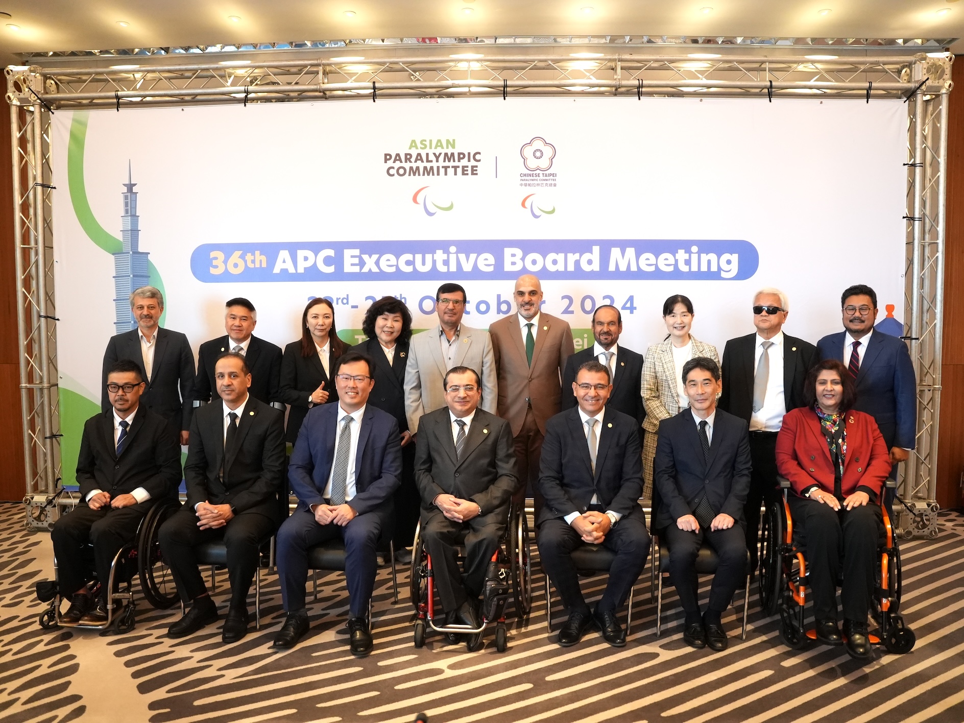 亞洲帕拉林匹克委員會執行委員會(Asian Paralympic Committee,簡稱APC)會議首度在臺灣舉行。APC主席Majid Rashed(前排右4)、體育署長鄭世忠(前排左3)、中華帕拉林匹克總會會長穆閩珠(後排左4)。(李亞璇攝)