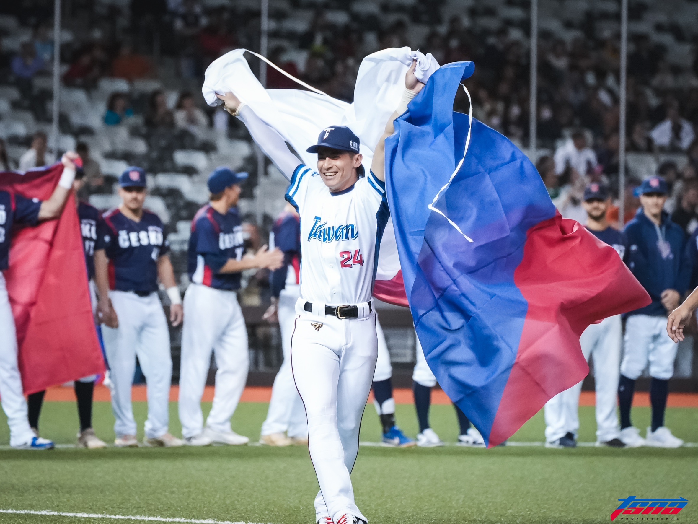 捷克國家隊遠道而來,今、明兩天與世界12強賽中華隊在台北大巨蛋打2場熱身賽,賽前介紹球員出場,今天先發7棒游擊手Vojtech Mensik特別披上中華民國國旗進場,而中華隊長陳傑憲出場時,也披上捷克的國旗,象徵台捷友好。