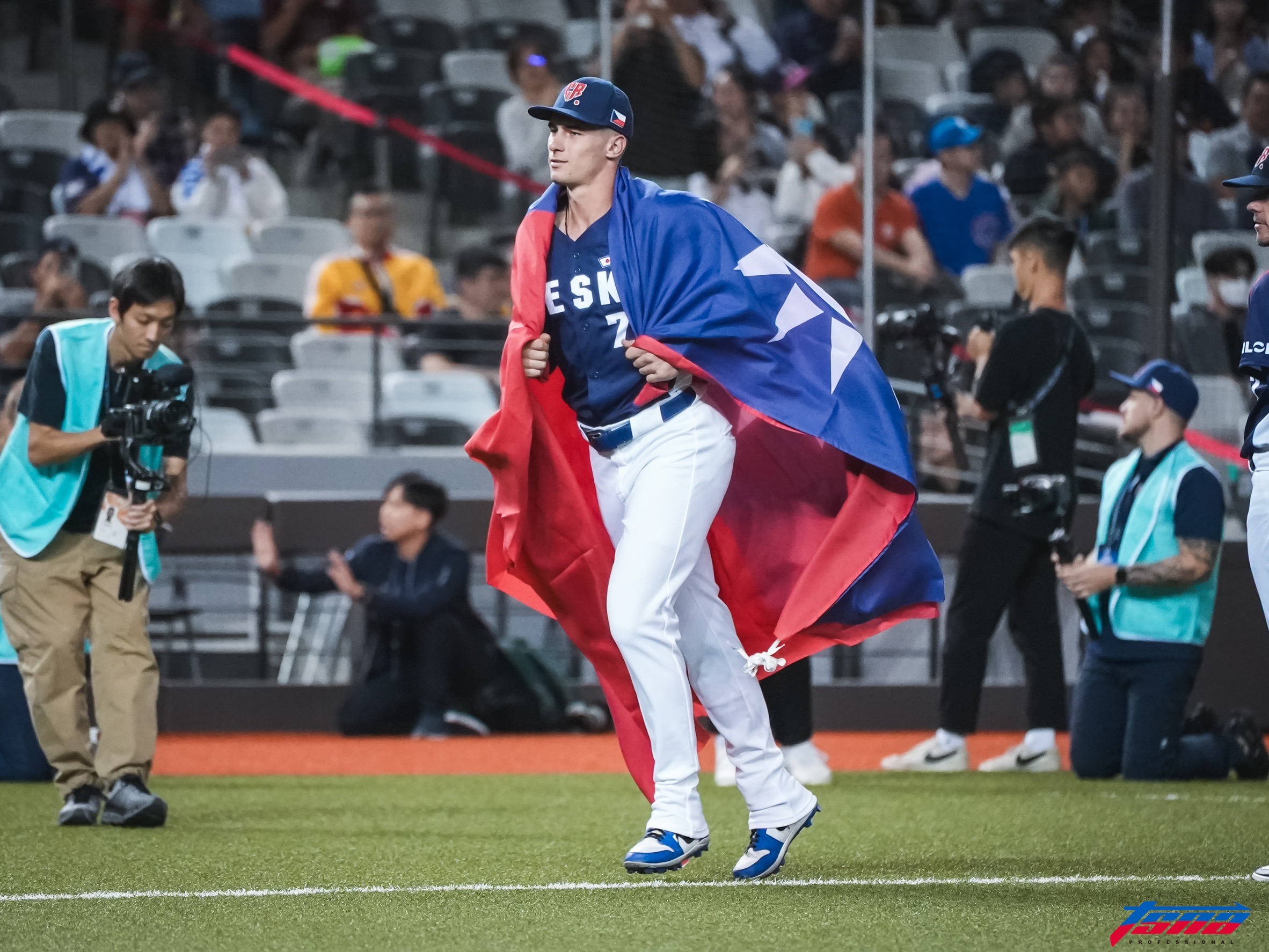 捷克隊73號球員Chlup披上中華民國國旗入場。(特約攝影蔡光逸攝)