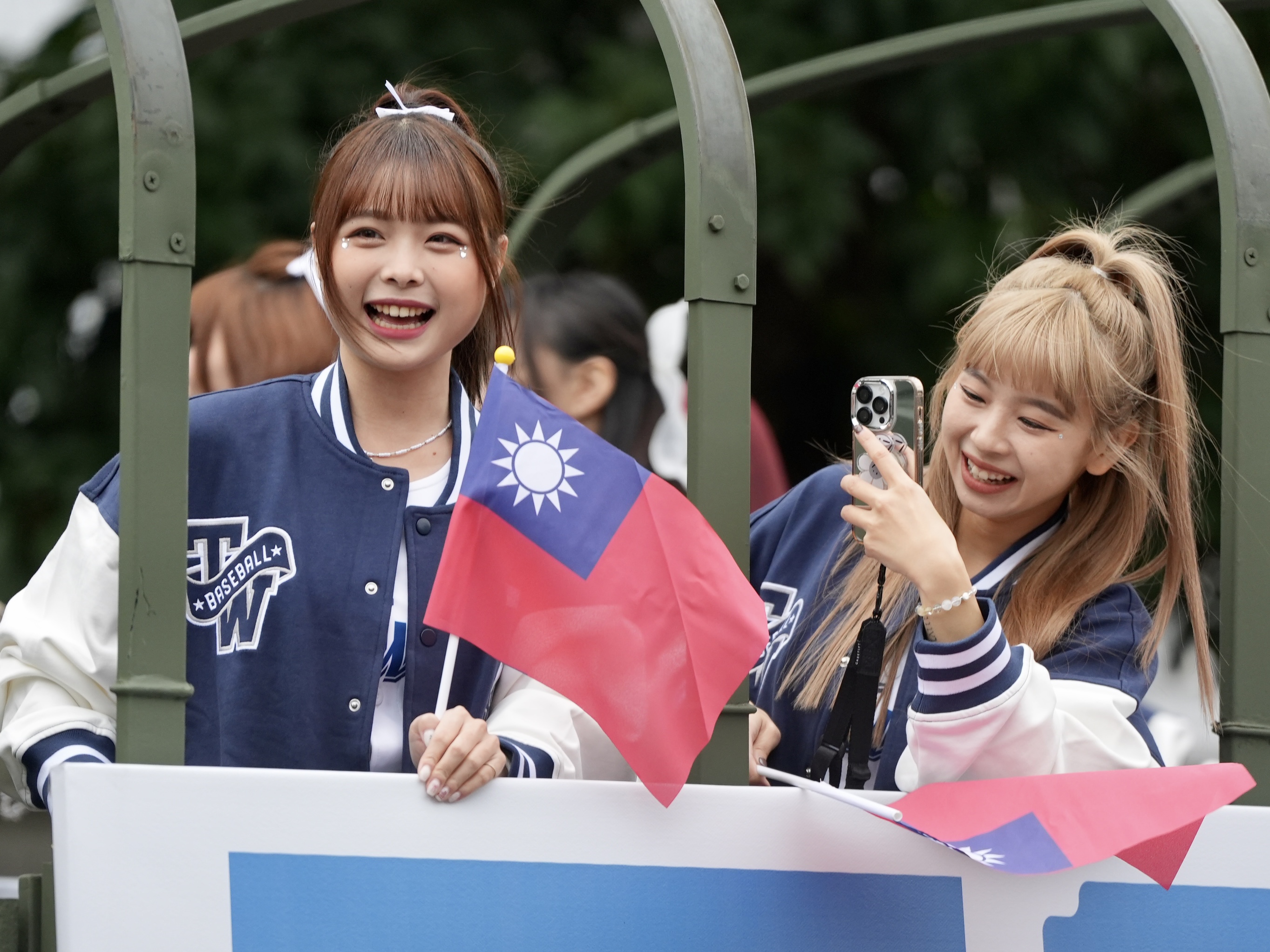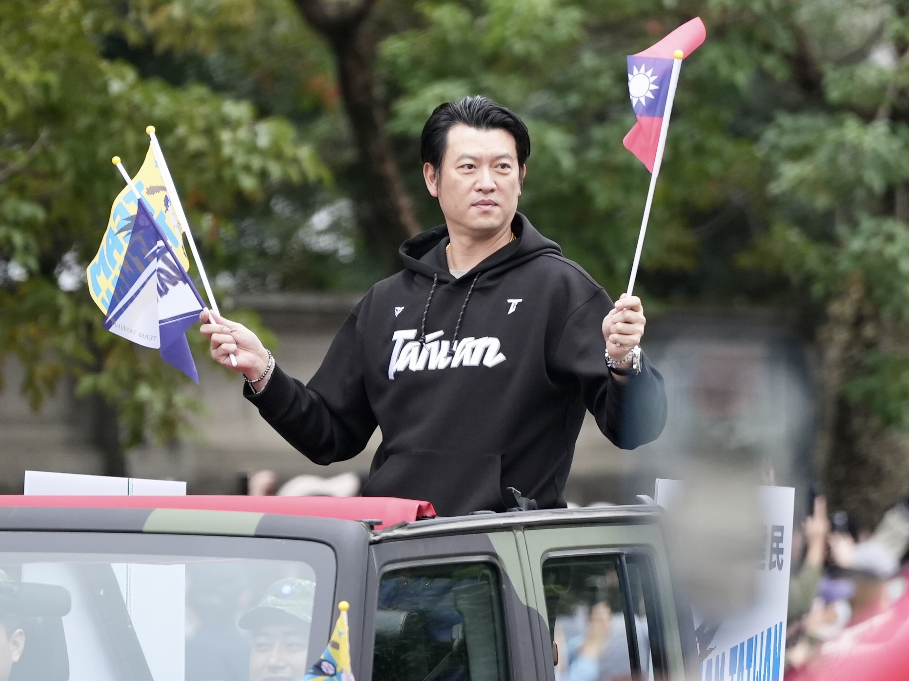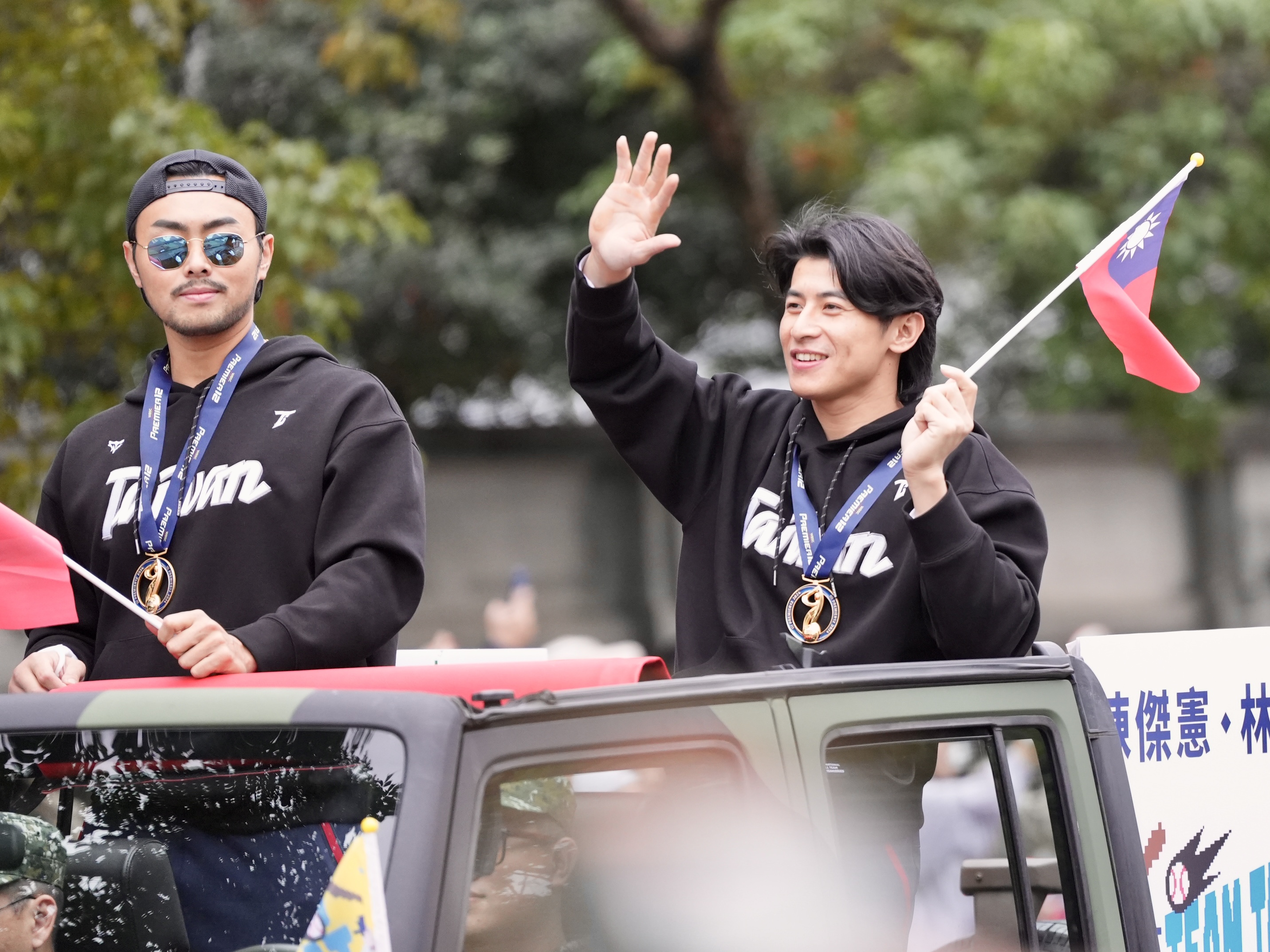 大遊行車隊上有中華隊教練、球員、後勤單位工作人員等,他們在車上興高采烈地揮手,不少人拿著手機紀錄,選手陳柏清還坐在車頂上,也開心的跟大家打招呼。而選手吉力吉撈·鞏冠則拿著國旗,身體跟著音樂律動。