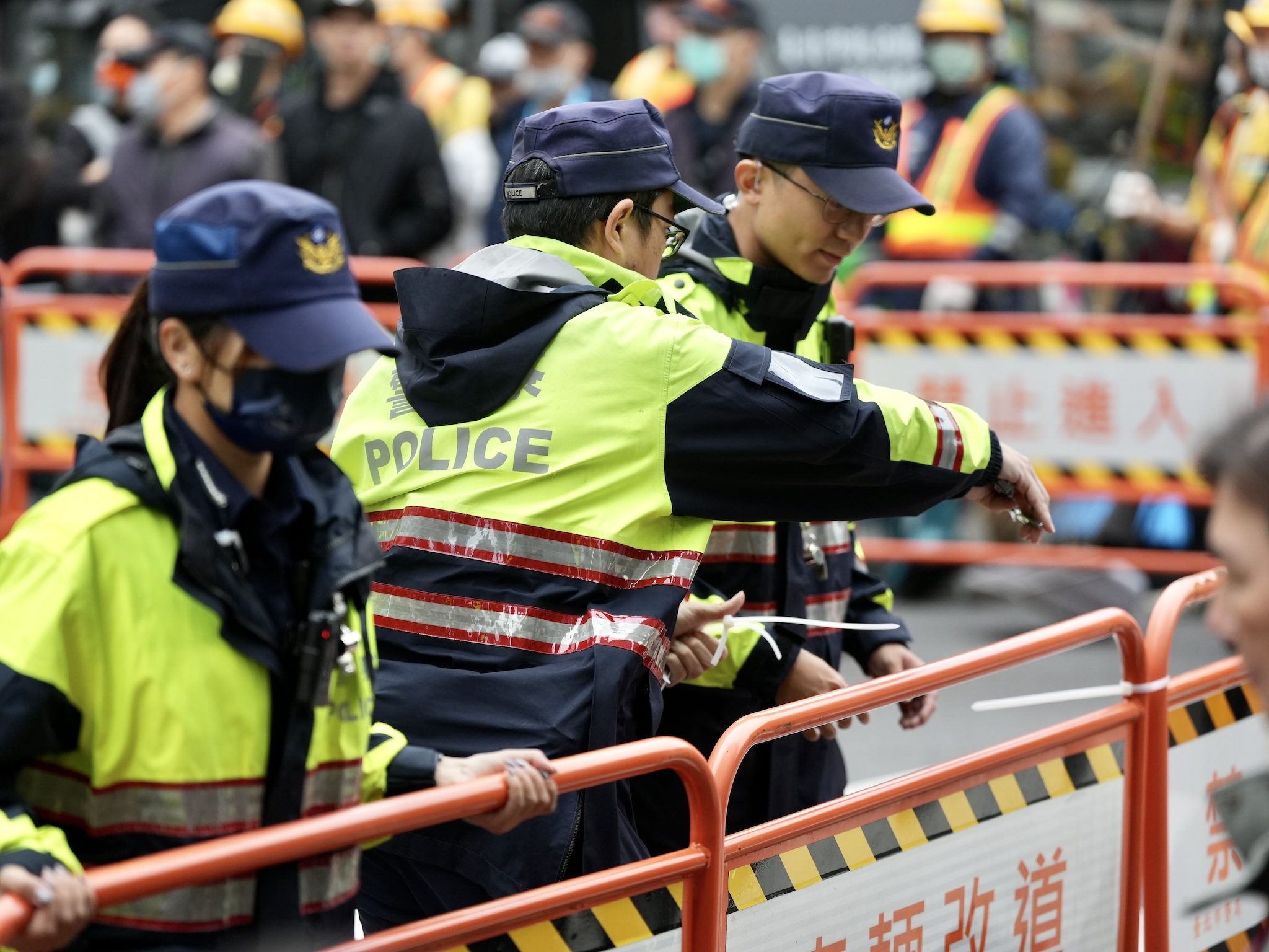 警察、義交,都迅速地架設、移動交通管制。(李宇政攝)