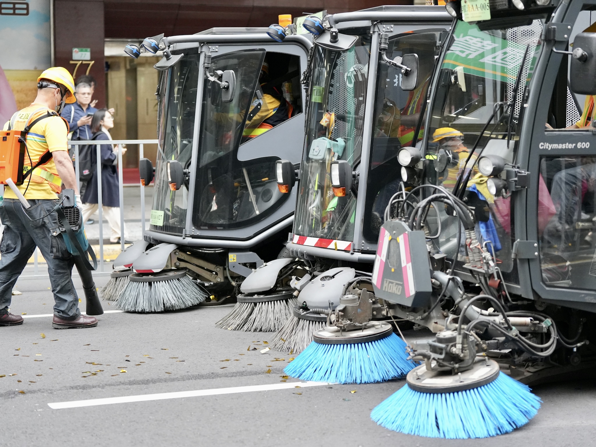 環保工作人員也迅速地清掃紙花。(李宇政攝)