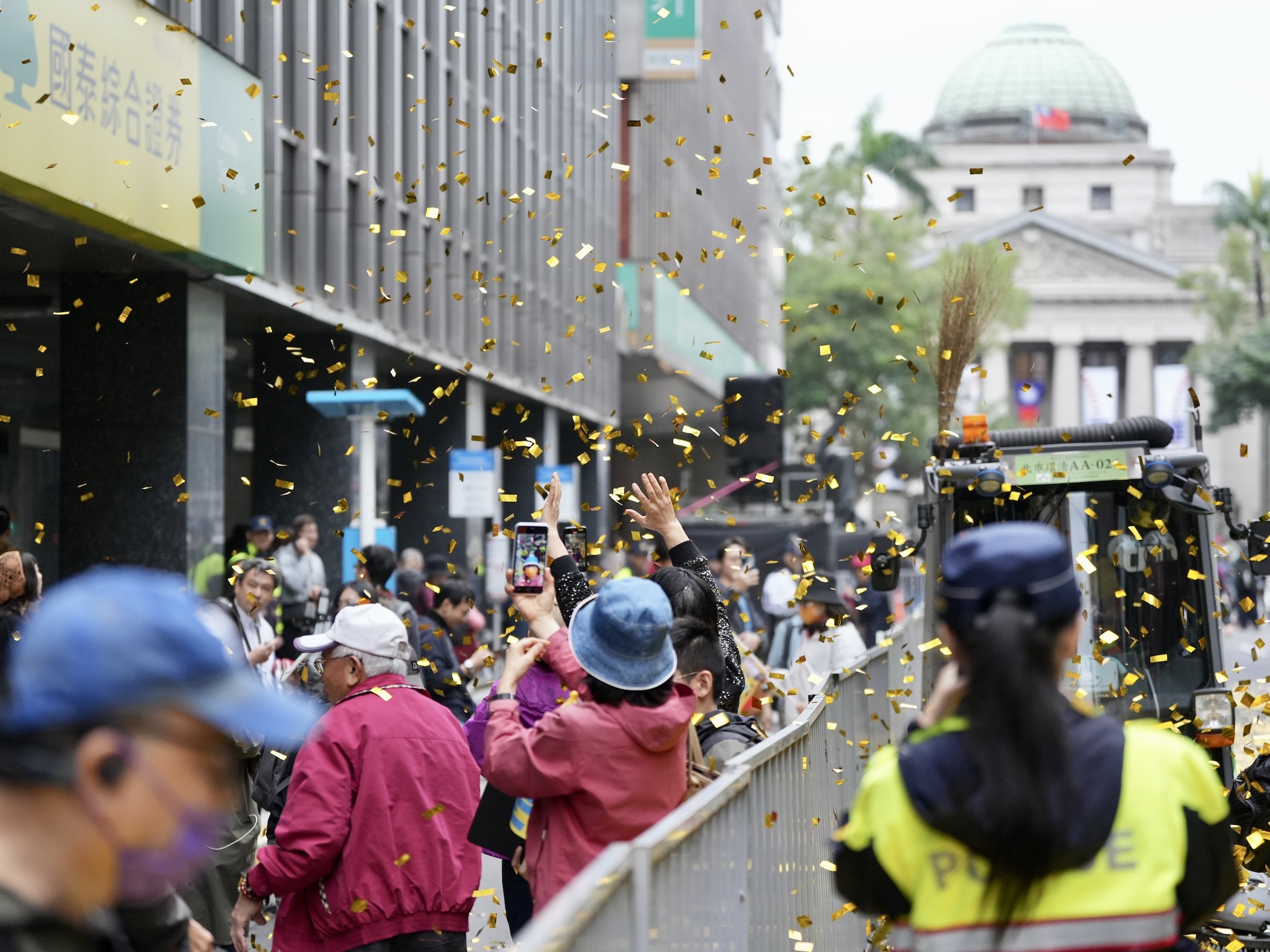 現場的警察、義交,都迅速地架設、移動交通管制,環保工作人員也迅速地清掃紙花,不少民眾把握機會,和空中飛舞的金色紙花合影,留下美好的回憶。