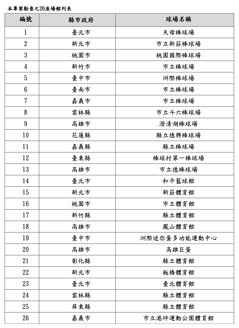 不過這26座運動場館中並沒有台北大巨蛋,體育署解釋,勘查時間是112年4月開始,由於當時台北大巨蛋尚未啟用,因此沒有台北大巨蛋。