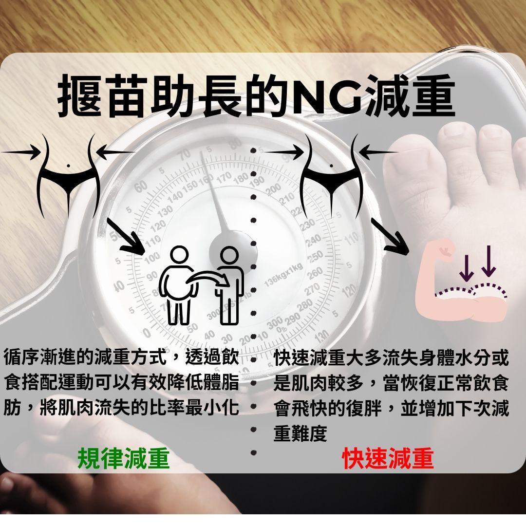 會有許多人想要透過較為極端的方式去減肥,像是節食、不吃澱粉或是攝取單一種類的食物,這些方法在短時間內確實都可以幫助體重在數字上有明顯的下降,但有可能減少的重量中,有絕大部分都是肌肉,當你一沒有維持這樣的飲食模式,體重馬上就回升,同時會比之前更難減重,這部分絕對不要貪戀一時數字上的呈現,而選擇揠苗助長的方式呀!