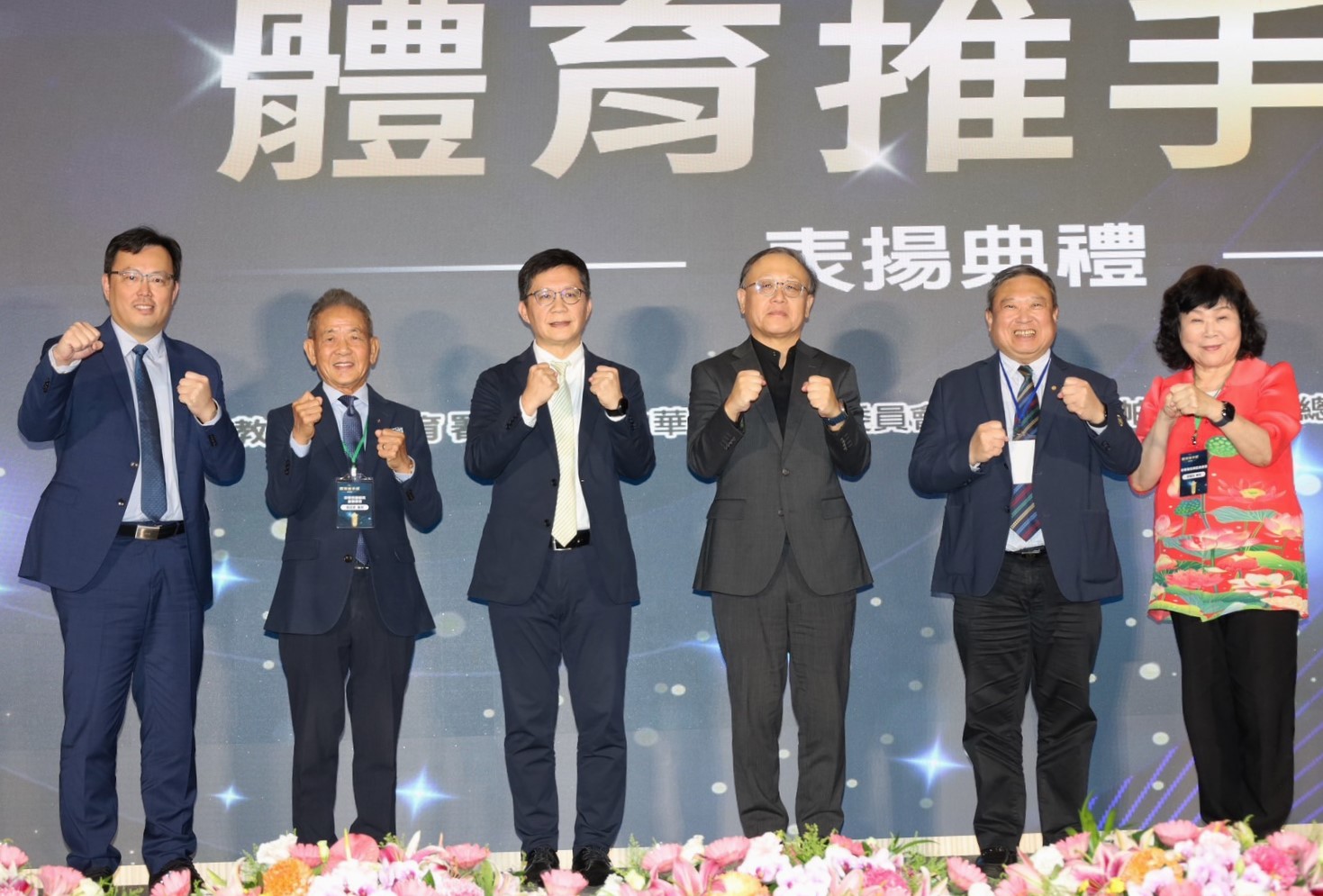 教育部體育署署長鄭世忠(左起)、中華民國體育運動總會會長葉政彥、教育部政務次長張廖萬堅、行政院政務委員史哲、中華奧林匹克委員會主席林鴻道、中華帕拉林匹克總會會長穆閩珠出席典禮。(體育署提供)