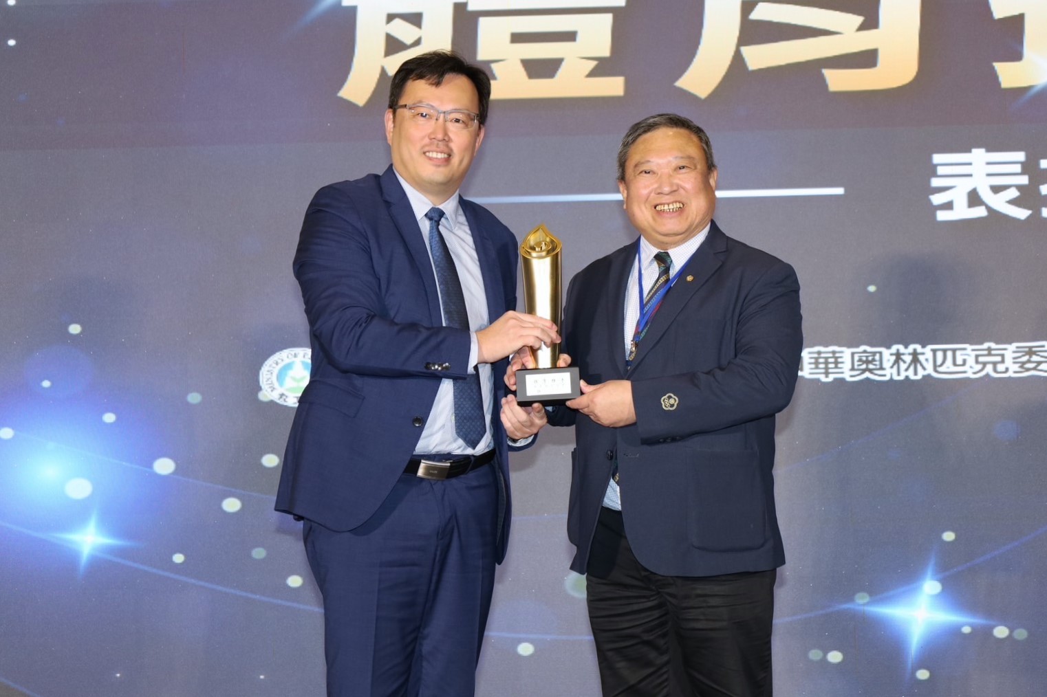 教育部體育署署長鄭世忠(左),致贈推展類金質獎獎盃給中華奧林匹克委員會主席林鴻道(右)。(體育署提供)