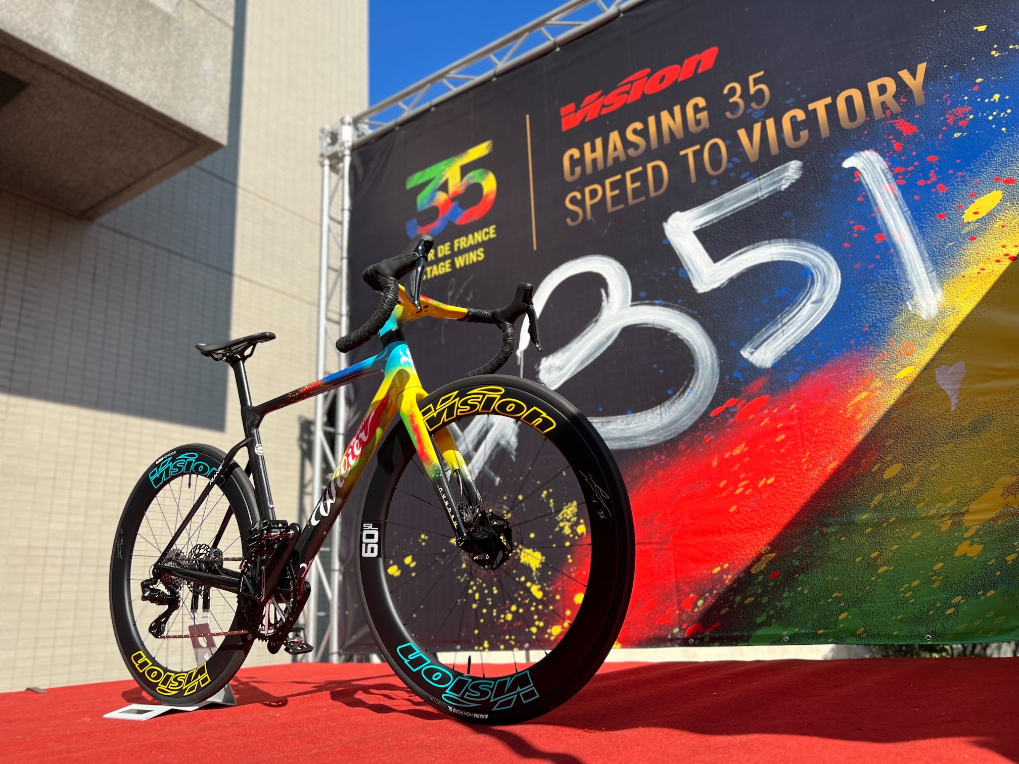 Mark Cavendish是在今年7月打破環法紀錄,當時那台「戰車」也跟著來到寶島台灣,車上零件正有台灣製造的 Vision 空力輪組,以及一體式把手,陪伴他寫下歷史性的一勝。