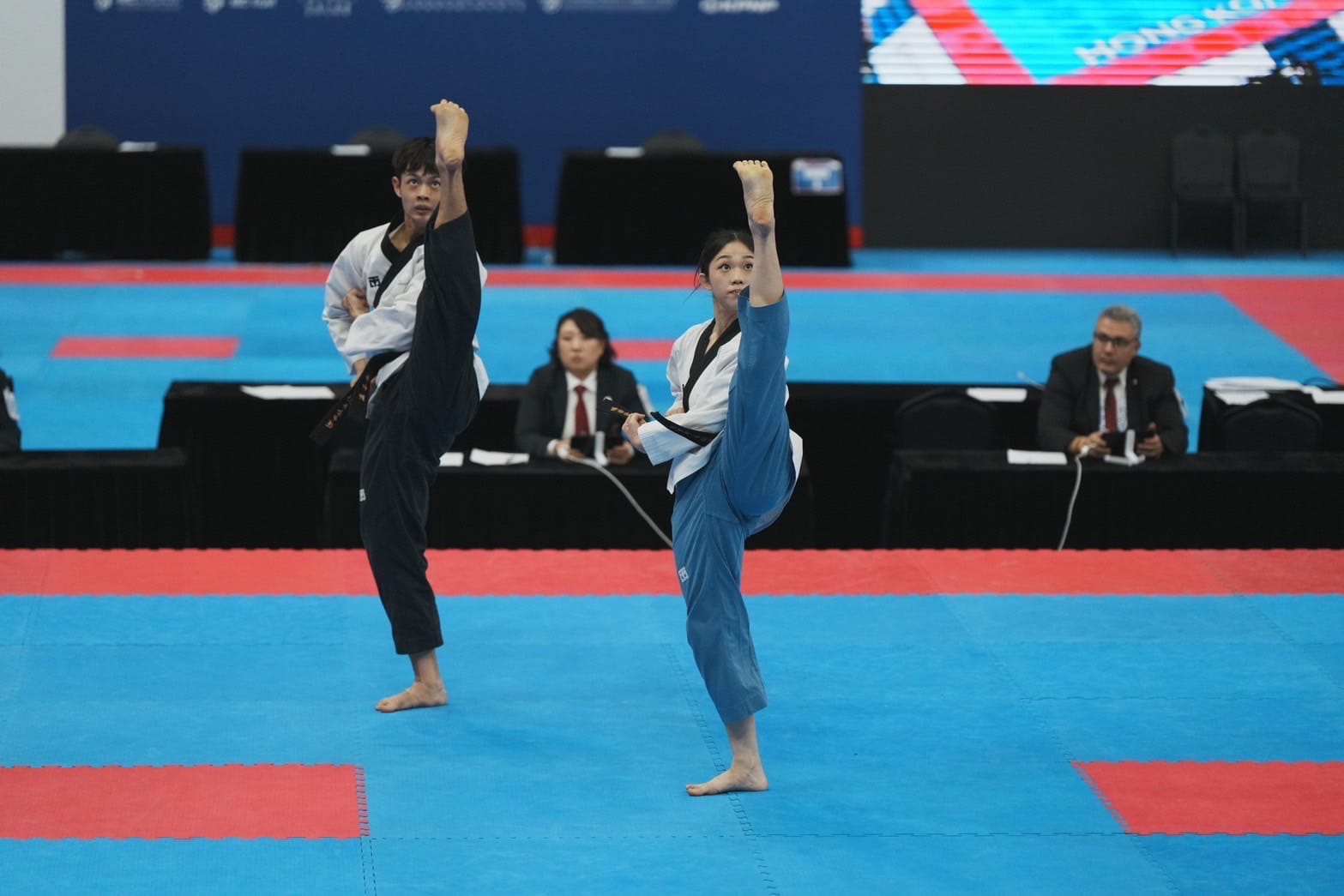 在香港體育館進行的世界跆拳道品勢錦標賽4日落幕,中華隊總共獲得4金5銀6銅,榮登團體第三名。其中,「小Mo女」吳庭瑜、蔡和軒克服南北距離,之前透過臺北城市盃跆拳道邀請賽備戰,默契十足,奪下公認品勢U30雙人配對組金牌