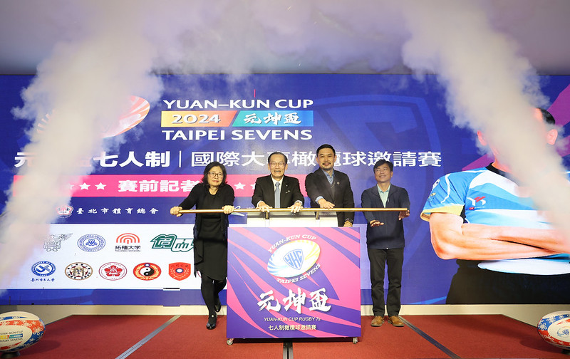 杜元坤(左2)為第5屆元坤盃舉行啟動儀式。(臺北元坤盃大專國際邀請七人制橄欖球賽提供)