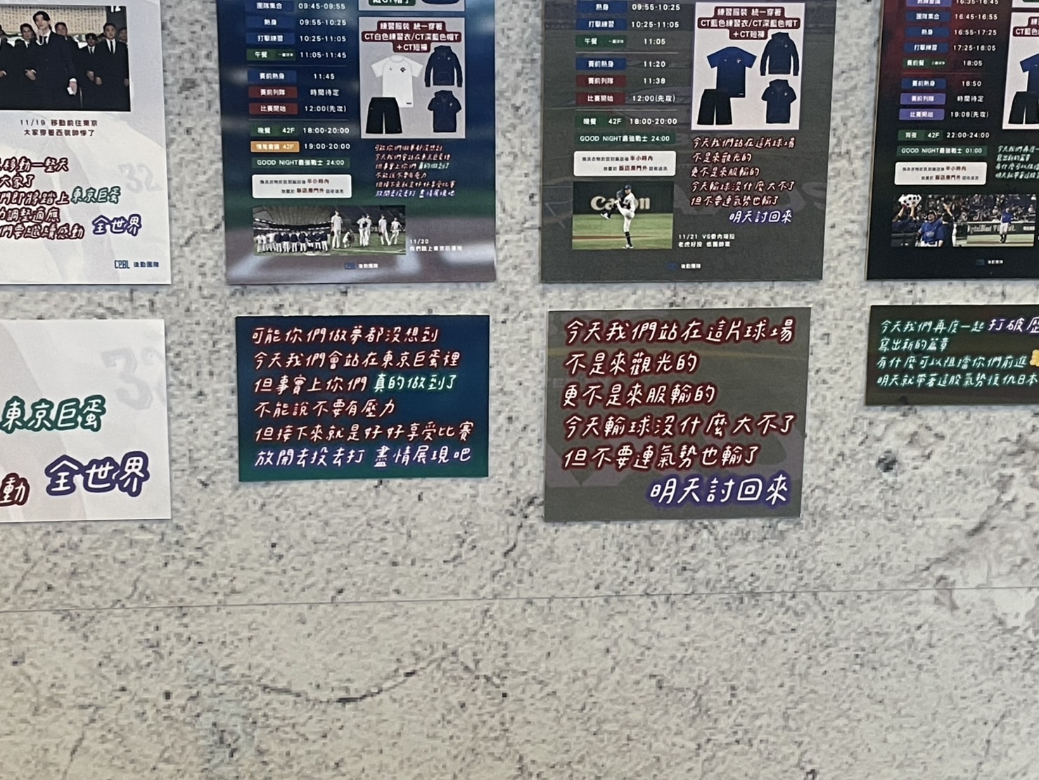 中信兄弟曾頌恩在昨日記者會後就推薦球迷可以去看比賽前後,中華隊後勤人員所寫的精神標語,其中有不少勵志話語,「我們不是來觀光的」,也打中球員的心。