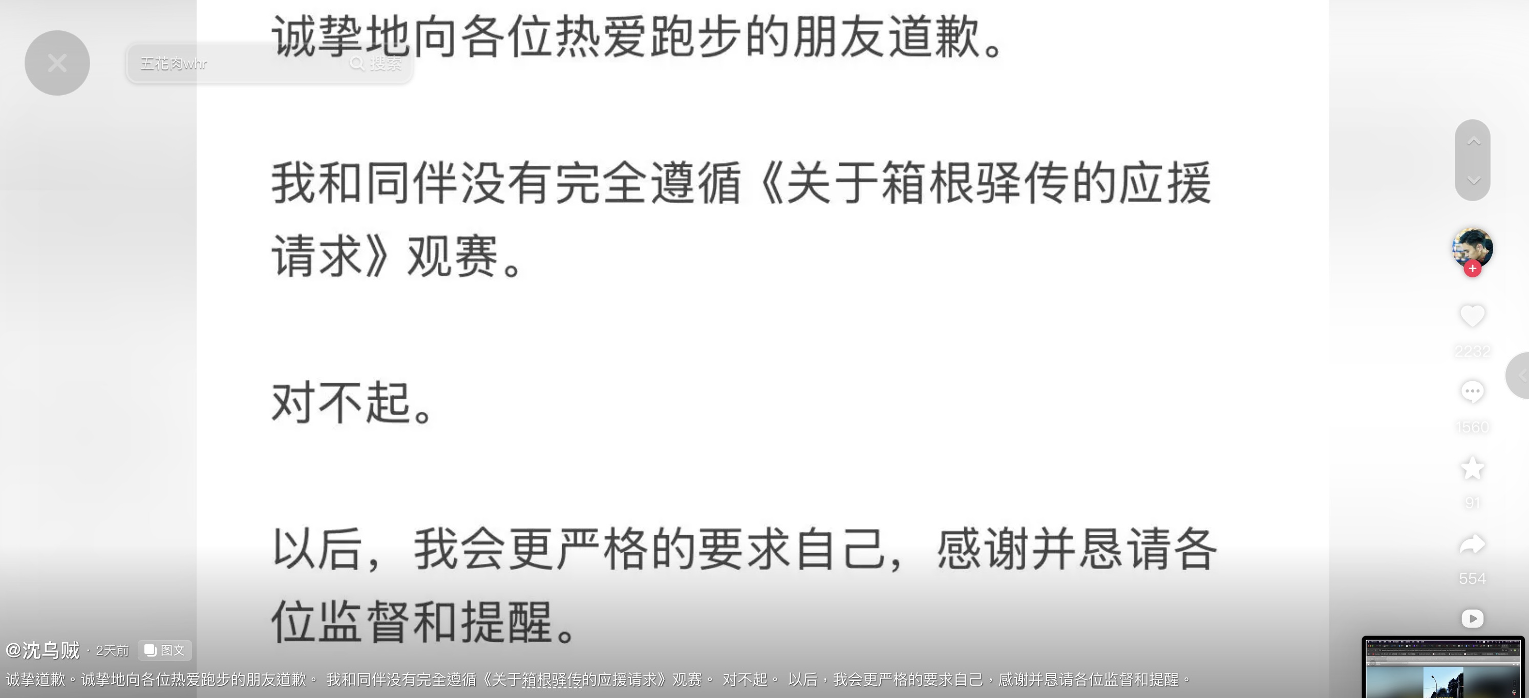 「沈烏賊」後來在TikTok上公開致歉,「向熱愛跑步的朋友們由衷致歉。我與同行者未遵守『箱根驛傳的應援規則』觀看比賽,十分抱歉。今後我會更加嚴以律己,希望大家予以指導與鞭策。」